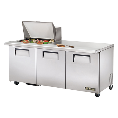 Upgrade your restaurant kitchen with the True Manufacturing TSSU-72-12M-B-HC Refrigerated Counter, Mega Top Sandwich/Salad Unit. This high-quality unit is designed to meet the demands of a busy commercial restaurant. With its stainless steel insulated cover and 8-7/8"D cutting board, it provides a convenient and hygienic workspace for preparing sandwiches and salads. The unit also features a spacious stainless steel top, front, and sides, ensuring durability and easy cleaning. The aluminum back and interior with a stainless steel floor further enhance its longevity. With three full doors and six shelves, you'll have ample storage space for your ingredients. The unit is equipped with 5" castors for easy mobility, allowing you to position it wherever it's most convenient. Additionally, the TSSU-72-12M-B-HC uses R290 Hydrocarbon refrigerant, making it energy-efficient and environmentally friendly. Trust True Manufacturing to deliver a reliable and efficient refrigerated counter that will elevate your restaurant's efficiency and productivity.