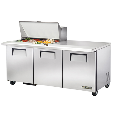 Craft culinary wonders with the True Manufacturing TSSU-72-15M-B-HC Refrigerated Counter, Mega Top Sandwich / Salad Unit. This top-of-the-line unit is designed to meet the demands of a busy commercial restaurant kitchen. With its spacious interior and (15) 1/6 size poly pans, you'll have plenty of room to store and organize your ingredients. The stainless steel insulated cover ensures that your food stays fresh and at the perfect temperature. The 8-7/8" cutting board provides a convenient workspace for preparing sandwiches and salads. The stainless steel construction of the top, front, and sides, along with the aluminum back, ensures durability and easy cleaning. The aluminum interior with a stainless steel floor is both hygienic and resistant to corrosion. With three full doors and six shelves, you'll have easy access to all your ingredients. The 5" castors make it easy to move the unit around your kitchen. Plus, with its energy-efficient design and R290 Hydrocarbon refrigerant, this unit is not only good for your business but also for the environment. Trust True Manufacturing for quality and reliability.