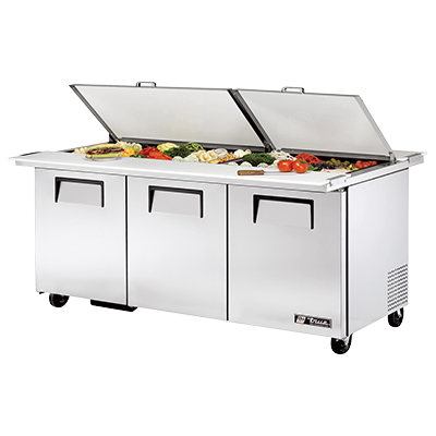 Culinary excellence in every dish starts with the True Manufacturing TSSU-72-30M-B-DS-ST-HC Refrigerated Counter. This mega top sandwich/salad unit is designed to meet the demands of a busy commercial restaurant kitchen. With its dual side configuration, it offers ample space for storing and organizing ingredients. The unit comes with 30 poly pans, each with a 4-inch depth, perfect for keeping your salad toppings and sandwich fillings fresh and easily accessible. The stainless steel insulated covers ensure optimal temperature retention, while the 11-3/4-inch cutting boards provide a convenient workspace for food preparation. Made in the USA, this unit features a durable stainless steel top, front, and sides, as well as an aluminum back for long-lasting performance. The aluminum interior with a stainless steel floor is easy to clean and maintain. Equipped with three full doors and six shelves, this unit offers plenty of storage options. The 5-inch castors make it easy to move the unit around the kitchen as needed. With its reliable 1/2 HP compressor and R290 Hydrocarbon refrigerant, this unit is energy-efficient and environmentally friendly. Trust True Manufacturing for a refrigerated counter that delivers exceptional performance and durability in a commercial restaurant setting.