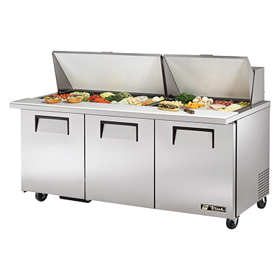 Elevate your dining experience with the True Manufacturing TSSU-72-30M-B-ST-HC Refrigerated Counter, Mega Top Sandwich/Salad Unit. This top-of-the-line unit is designed to meet the demands of a busy commercial restaurant. With its spacious interior, you can store and organize all your sandwich and salad ingredients effortlessly. The unit comes with (30) 1/6 size poly pans, each with a 4-inch depth, allowing you to keep a wide variety of toppings and fillings at the perfect temperature. The stainless steel insulated covers ensure maximum freshness and hygiene. The 8-7/8-inch cutting board provides a convenient workspace for food preparation. Made in the USA, this unit features a durable stainless steel top, front, and sides, as well as an aluminum back for long-lasting performance. The aluminum interior with a stainless steel floor is easy to clean and maintain. Equipped with three full doors and six shelves, this unit offers ample storage space. The 5-inch castors make it easy to move the unit for cleaning or rearranging. With its energy-efficient design and R290 Hydrocarbon refrigerant, this unit not only saves on energy costs but also reduces environmental impact. Trust True Manufacturing to deliver exceptional quality and reliability for your commercial restaurant needs.