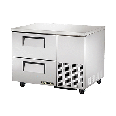 Cook with confidence with the True Manufacturing TUC-44D-2-HC Refrigerator. This undercounter reach-in refrigerator is designed to meet the demands of a commercial restaurant kitchen. With its stainless steel top and sides, it not only looks sleek but also ensures durability and easy cleaning. The refrigerator features two drawers, each capable of accommodating two 12" x 20" x 8" pans (pans not included), providing ample storage space for your ingredients. The aluminum interior with a stainless steel floor further enhances its durability and hygiene. Equipped with 5" castors, this refrigerator is easy to move and position wherever you need it. The side mount design allows for easy access to the drawers, making it convenient for busy kitchen environments. With its R290 Hydrocarbon refrigerant and 1/10 HP compressor, this refrigerator is energy-efficient and environmentally friendly. Trust True Manufacturing for a reliable and efficient refrigeration solution for your commercial kitchen.