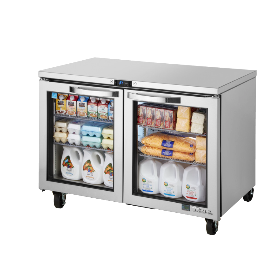 Achieve culinary excellence with the True Manufacturing TUC-48G-HC~SPEC3 Undercounter Refrigerator. This top-of-the-line refrigerator is designed to meet the demanding needs of commercial restaurants. With its SPEC Package 3, it offers a range of features that ensure optimal performance and convenience. The 16-gauge stainless steel top, sides, and back provide durability and a sleek appearance, while the stainless steel interior is easy to clean and maintain. The two Low-E glass doors not only enhance visibility but also come with steel handles and a door lock for added security. Inside, you'll find four shelves that offer ample storage space for your ingredients and products. The electronic temperature control with a digital display allows you to easily monitor and adjust the temperature between 33 and 38 degrees Fahrenheit. With its 5" castors, this refrigerator is easy to move and position wherever you need it. Made in the USA and featuring R290 Hydrocarbon refrigerant, this True Manufacturing undercounter refrigerator is not only reliable but also environmentally friendly. Elevate your restaurant's efficiency and organization with the True Manufacturing TUC-48G-HC~SPEC3 Undercounter Refrigerator.