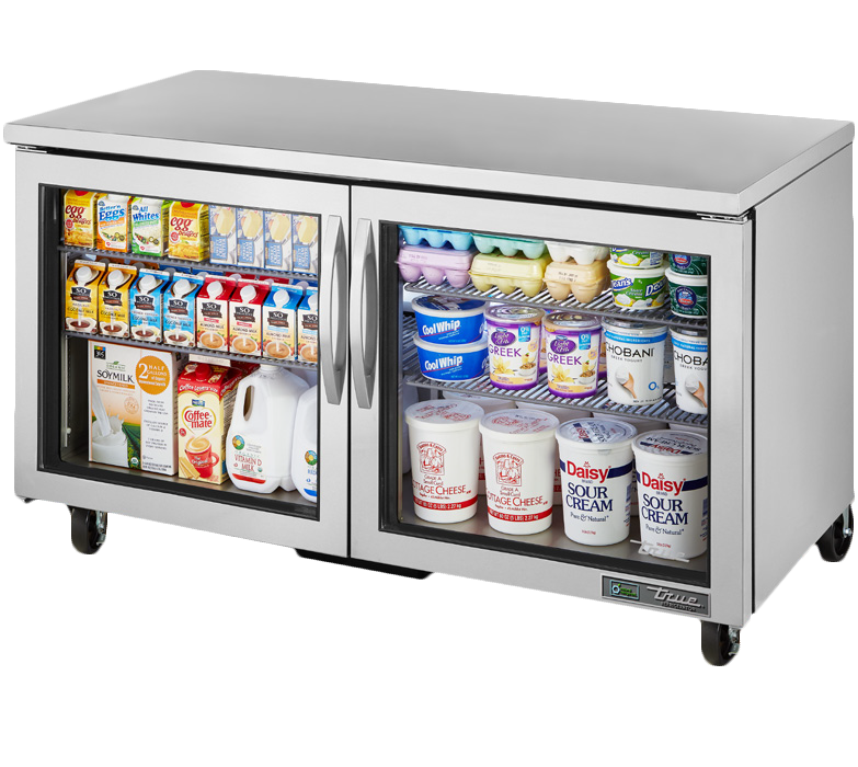 Craft culinary wonders with the True Manufacturing TUC-60G-HC~FGD01 Refrigerator. This undercounter reach-in refrigerator is designed to meet the demands of a commercial restaurant setting. With its stainless steel top and sides, it not only looks sleek but also ensures durability and easy cleaning. The framed glass doors, made with Low-E glass, provide a clear view of the contents while maintaining energy efficiency. Inside, you'll find four shelves and an aluminum interior with a stainless steel floor, offering ample storage space and easy maintenance. The 5" castors make it easy to move the refrigerator for cleaning or rearranging. Powered by a 1/4 HP compressor and using R290 Hydrocarbon refrigerant, this unit is energy-efficient and environmentally friendly. With its cULus and UL EPH Classified certifications, you can trust in its quality and safety. Elevate your culinary creations with the True Manufacturing TUC-60G-HC~FGD01 Refrigerator.