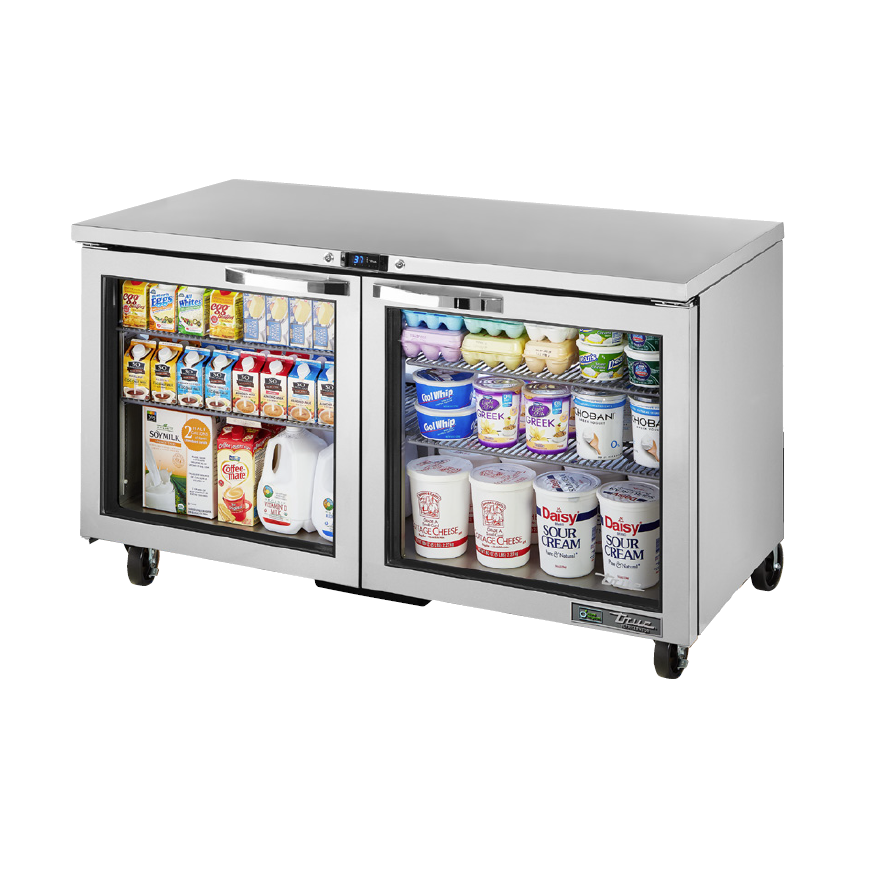 Ignite culinary passion with the True Manufacturing TUC-60G-HC~SPEC3 Undercounter Refrigerator. This top-of-the-line refrigerator is designed to meet the demanding needs of commercial restaurants. With its SPEC Package 3, it offers a range of features that make it a valuable addition to any kitchen. The 16-gauge stainless steel top, sides, and back ensure durability and easy cleaning, while the stainless steel interior provides a hygienic storage space. The two Low-E glass doors not only showcase your ingredients but also help to conserve energy. The electronic temperature control with a digital display allows for precise temperature management, ensuring your perishables stay fresh. With four shelves and a door lock, you can organize and secure your items with ease. The 5" castors make it effortless to move the refrigerator for cleaning or rearranging. Made in the USA and UL EPH Classified, this True Manufacturing undercounter refrigerator is a reliable and efficient choice for any commercial kitchen.