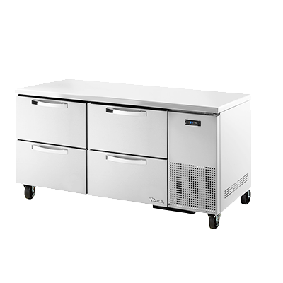 Elevate your cuisine with the True Manufacturing TUC-67D-4-HC~SPEC3 Refrigerator. This undercounter reach-in refrigerator is designed to meet the demands of a commercial restaurant setting. With its SPEC Package 3, it offers a 16-gauge stainless steel top, sides, and back, ensuring durability and easy cleaning. The stainless steel interior and four drawers provide ample storage space for your ingredients, while accommodating two 12" x 20" x 8" pans (not included). The electronic temperature control with a digital display allows you to easily monitor and adjust the temperature between 33 - 38F, ensuring your ingredients stay fresh. The 5" castors make it easy to move the refrigerator for cleaning or rearranging your kitchen layout. Made in the USA, this True Manufacturing refrigerator is UL EPH Classified and uses R290 Hydrocarbon refrigerant, making it both efficient and environmentally friendly. Upgrade your kitchen with this reliable and high-performing undercounter refrigerator.