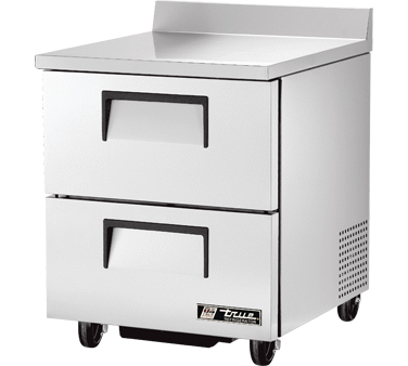Unleash your inner chef with the True Manufacturing TWT-27D-2-HC Refrigerated Counter. This work top refrigerator is perfect for commercial restaurant use, offering a convenient and efficient way to store and prepare ingredients. With its stainless steel top and rear splash, this one-section unit is not only durable but also easy to clean. The two drawers can each accommodate a 12" x 20" x 6" pan, allowing for organized storage and easy access to ingredients. The clear coated aluminum interior with a stainless steel floor ensures optimal hygiene and durability. Equipped with 5" castors and rear mount, this refrigerator is easy to move and position in your kitchen. The TWT-27D-2-HC uses R290 Hydrocarbon refrigerant, which is not only environmentally friendly but also energy-efficient. With a 1/6 HP compressor, this unit provides reliable cooling while consuming minimal energy. Made in the USA and certified by cULus, UL EPH Classified, and CE, you can trust the quality and safety of this True Manufacturing Refrigerated Counter. Upgrade your kitchen with the TWT-27D-2-HC and experience the convenience and efficiency it brings to your culinary endeavors.