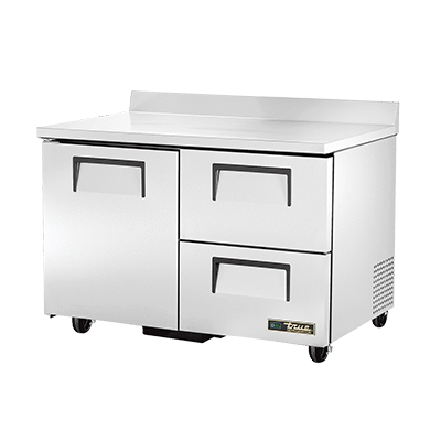 Unleash your inner chef with the True Manufacturing TWT-48D-2-HC Refrigerated Counter. This two-section work top refrigerator is designed to meet the demands of a busy commercial restaurant. With its stainless steel top and rear splash, it not only provides a durable and easy-to-clean surface but also adds a touch of elegance to your kitchen. The unit features one stainless steel door and two shelves, along with two drawers that can accommodate a 12" x 18" x 6" pan (not included). The aluminum interior with a stainless steel floor ensures optimal temperature retention and hygiene. Equipped with 5" castors and a rear mount, this refrigerator is easy to move and position. Powered by a 1/5 HP compressor and using R290 Hydrocarbon refrigerant, it delivers efficient cooling while being environmentally friendly. Made in the USA, this True Manufacturing Refrigerated Counter is a reliable and high-quality addition to any commercial kitchen.