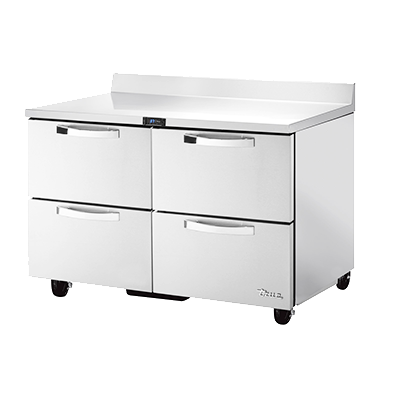 Unleash culinary creativity with the True Manufacturing TWT-48D-4-HC~SPEC3 Refrigerated Counter. This work top refrigerator is a must-have for any commercial restaurant. With its SPEC Package 3, it offers a 16-gauge stainless steel top with a rear splash, as well as stainless steel front, sides, and back for durability and easy cleaning. The stainless steel interior and four drawers provide ample storage space for food items, accommodating a 12" x 18" x 6" food storage box in each drawer. The electronic temperature control with a digital display ensures precise temperature management, while the 5" castors allow for easy mobility. Made in the USA, this refrigerator is not only reliable but also environmentally friendly, thanks to its use of R290 Hydrocarbon refrigerant. Upgrade your kitchen with the True Manufacturing TWT-48D-4-HC~SPEC3 Refrigerated Counter and experience the convenience and efficiency it brings to your culinary endeavors.