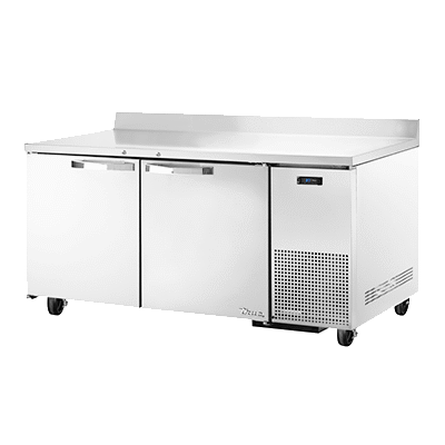 Optimize your kitchen efficiency with the True Manufacturing TWT-67-HC~SPEC3 Refrigerated Counter. This two-section work top refrigerator is a game-changer for commercial restaurants. With its SPEC Package 3, it offers a 16-gauge stainless steel top with a rear splash, ensuring durability and easy cleaning. The stainless steel front, sides, and back add a sleek and professional look to your kitchen. Inside, you'll find a spacious stainless steel interior with four shelves, providing ample storage for your ingredients. The two heavy-duty stainless steel doors come with steel handles and a door lock for added security. The electronic temperature control with a digital display allows you to easily monitor and adjust the temperature. With 5" castors and a side mount front breather, this refrigerator is easy to move and position in your kitchen. It runs on R290 Hydrocarbon refrigerant and has a 1/10 HP motor, ensuring energy efficiency. Made in the USA, this True Manufacturing Refrigerated Counter is cULus and UL EPH Classified, guaranteeing its quality and safety. Upgrade your kitchen with this reliable and efficient work top refrigerator.
