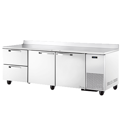 Culinary artistry redefined with True Manufacturing's TWT-93D-2-HC~SPEC3 Refrigerated Counter. This three-section work top refrigerator is designed to meet the demands of a busy commercial restaurant kitchen. The 16-gauge stainless steel top with a rear splash provides a durable and easy-to-clean surface for food preparation. The stainless steel front, sides, and back ensure long-lasting performance and a sleek appearance. With two heavy-duty stainless steel doors that come with locks, you can securely store your ingredients and supplies. The interior features stainless steel construction and four shelves, along with two drawers in each section, allowing for efficient organization and easy access to your items. The electronic temperature control with a digital display ensures precise temperature management, while the 5" castors make it easy to move the refrigerator for cleaning or rearranging. With its reliable performance, spacious storage capacity, and high-quality construction, the True Manufacturing TWT-93D-2-HC~SPEC3 is the perfect addition to any commercial restaurant kitchen.