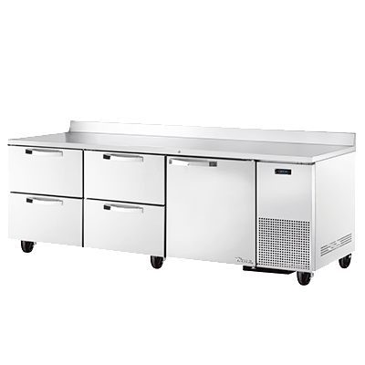 Achieve kitchen supremacy with the True Manufacturing TWT-93D-4-HC~SPEC3 Refrigerated Counter Work Top. This three-section work top refrigerator is designed to meet the demands of a busy commercial restaurant kitchen. With its 16-gauge stainless steel top and rear splash, stainless steel front, sides, and back, and stainless steel interior, this unit is built to withstand the rigors of a professional kitchen. The heavy-duty stainless steel door comes with a lock for added security, and the two shelves and four drawers provide ample storage space for ingredients and supplies. The refrigerator can accommodate two 12" x 20" x 8" pans (not included), making it perfect for storing prepped ingredients. The electronic temperature control with a digital display ensures precise temperature management, while the 5" castors allow for easy mobility. Made in the USA, this True Manufacturing work top refrigerator is UL EPH Classified and cULus listed, guaranteeing its quality and reliability. Upgrade your kitchen with the TWT-93D-4-HC~SPEC3 and experience the difference in performance and durability.