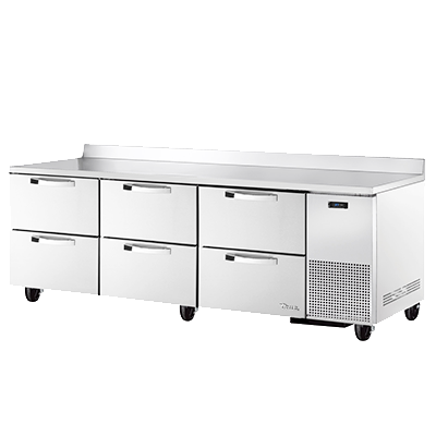 Boost your restaurant's performance with the True Manufacturing TWT-93D-6-HC~SPEC3 Refrigerated Counter Work Top. This three-section work top refrigerator is part of the SPEC SERIES, designed to meet the demanding needs of commercial kitchens. It features a 16-gauge stainless steel top with a rear splash, ensuring durability and easy cleaning. The stainless steel front, sides, and back further enhance its longevity and professional appearance. With six drawers, each accommodating two 12" x 20" x 8" pans (not included), you'll have ample storage space for your ingredients. The electronic temperature control with a digital display allows for precise temperature management, ensuring your perishable items stay fresh. The 5" castors make it easy to move the refrigerator for cleaning or rearranging your kitchen layout. Made in the USA, this True Manufacturing work top refrigerator is UL EPH Classified and uses R290 Hydrocarbon refrigerant, making it an energy-efficient and environmentally friendly choice. Upgrade your kitchen with this reliable and efficient refrigerated counter work top.