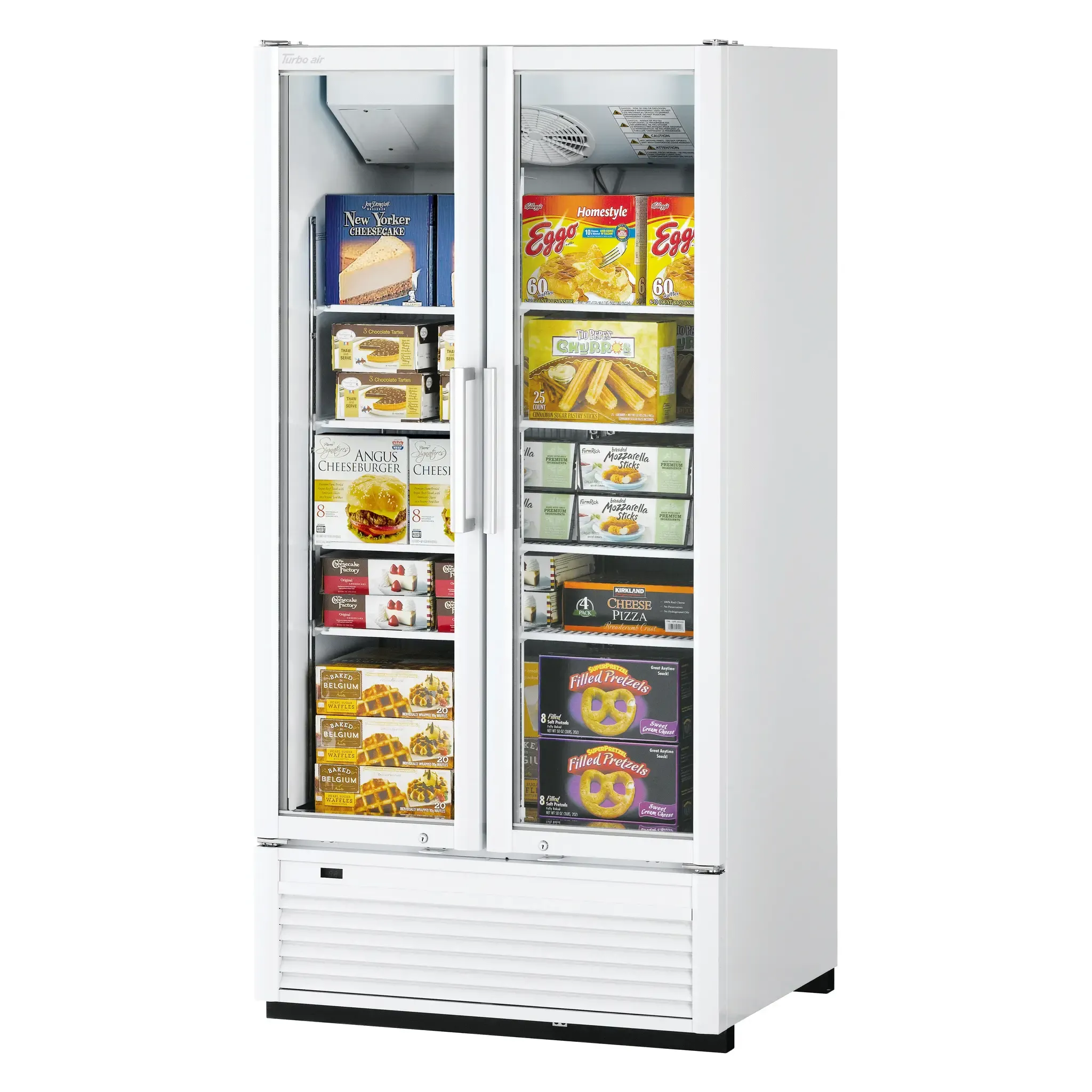 Boost your restaurant's performance with the Turbo Air TGF-35SDH-N Freezer Merchandiser. This super deluxe two-section freezer is designed to meet the demands of a busy commercial kitchen. With a spacious 30.94 cu. ft. capacity, it provides ample storage space for your frozen goods. The self-contained bottom mounted refrigeration system ensures efficient cooling, with a temperature range of -10 to -5F to keep your products at the perfect temperature. The self-cleaning condenser device prevents dust buildup, reducing maintenance and extending the lifespan of the unit. The triple pane heated glass doors not only provide a clear view of your merchandise but also come with a lock for added security. The door-activated alarm system alerts you if the doors are left open, preventing any potential spoilage. The exterior digital thermometer and controller allow for easy monitoring and precise temperature control. The LED interior lighting illuminates the contents, making it easy to find what you need. With eight adjustable shelves, you can customize the storage space to suit your needs. The automatic fan motor delays prevent hot air from entering the unit when the doors are opened, ensuring consistent cooling performance. The white interior is easy to clean and maintain, while the exterior cabinet color can be specified to match your restaurant's decor. The TGF-35SDH-N uses R290 Hydrocarbon refrigerant, which is environmentally friendly and energy-efficient. With a 3/4 HP compressor, this freezer merchandiser delivers powerful performance while consuming minimal energy. It operates on 115v/60/1-ph power and comes with a 6.8 amp cord for easy installation. The TGF-35SDH-N is cETLus and ETL-Sanitation listed, guaranteeing its safety and compliance with industry standards. Upgrade your restaurant's freezer storage with the Turbo Air TGF-35SDH-N Freezer Merchandiser and experience the convenience and efficiency it brings to your kitchen.