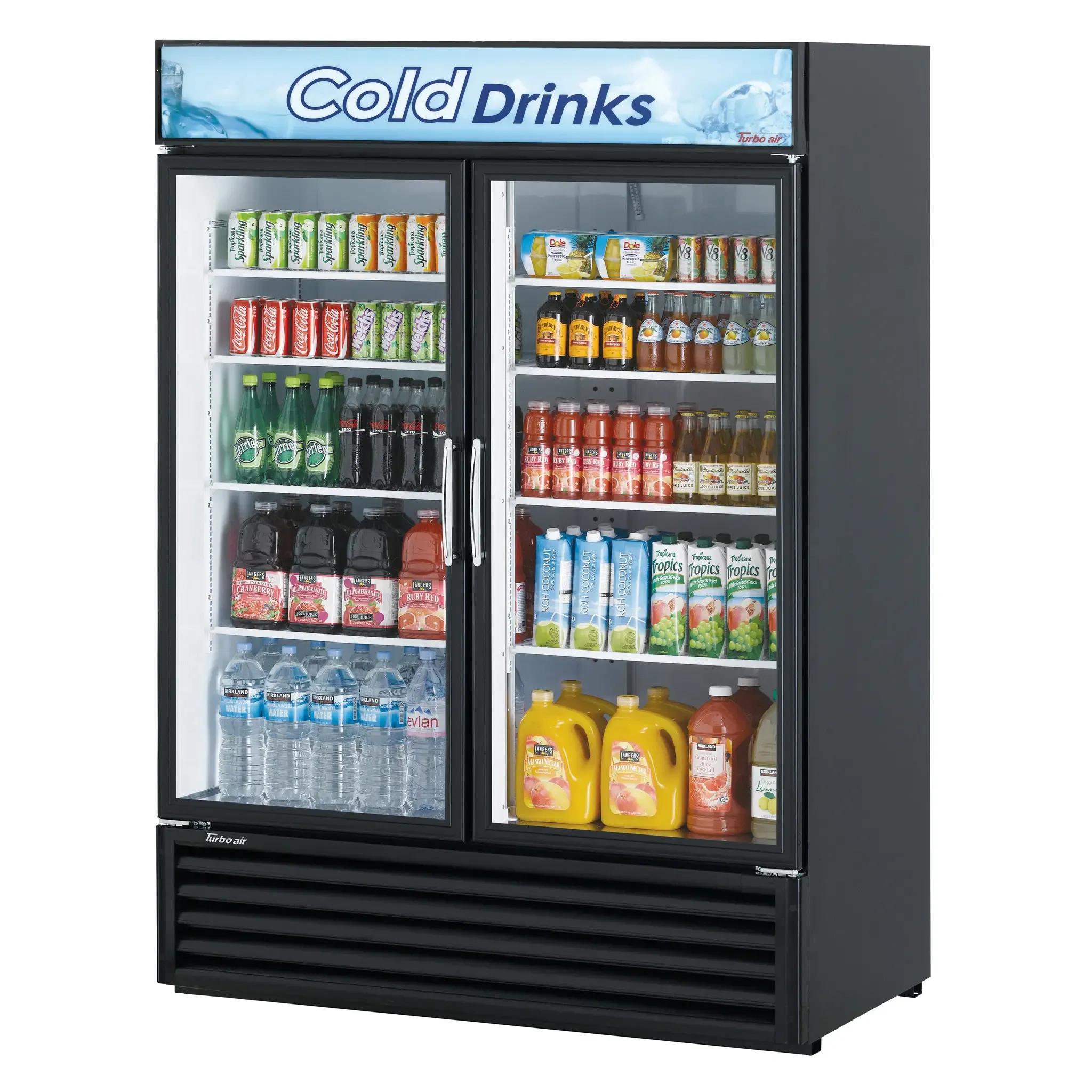 Realize kitchen dreams with the Turbo Air TGM-50RSB-N Refrigerator Merchandiser. This two-section refrigerated merchandiser is perfect for commercial restaurant use, offering a spacious 45.97 cu. ft. capacity to store and display a wide variety of food and beverages. The unit features two double pane Low-E self-closing swing glass doors, allowing customers to easily see and access the products inside. With LED interior and canopy lighting, the merchandiser beautifully showcases the items, enticing customers to make a purchase. The energy conserving fan control and hot gas condensate system ensure efficient operation, while the eight adjustable PE coated wire shelves provide flexibility in organizing the products. The black cabinet adds a sleek and professional look to any restaurant setting. With a bottom mount compressor and R290 Hydrocarbon refrigerant, this merchandiser is not only reliable but also environmentally friendly. It is ETL-Sanitation, cETLus, and ENERGY STAR certified, guaranteeing its quality and efficiency. Upgrade your restaurant with the Turbo Air TGM-50RSB-N Refrigerator Merchandiser and attract customers with its impressive features and performance.