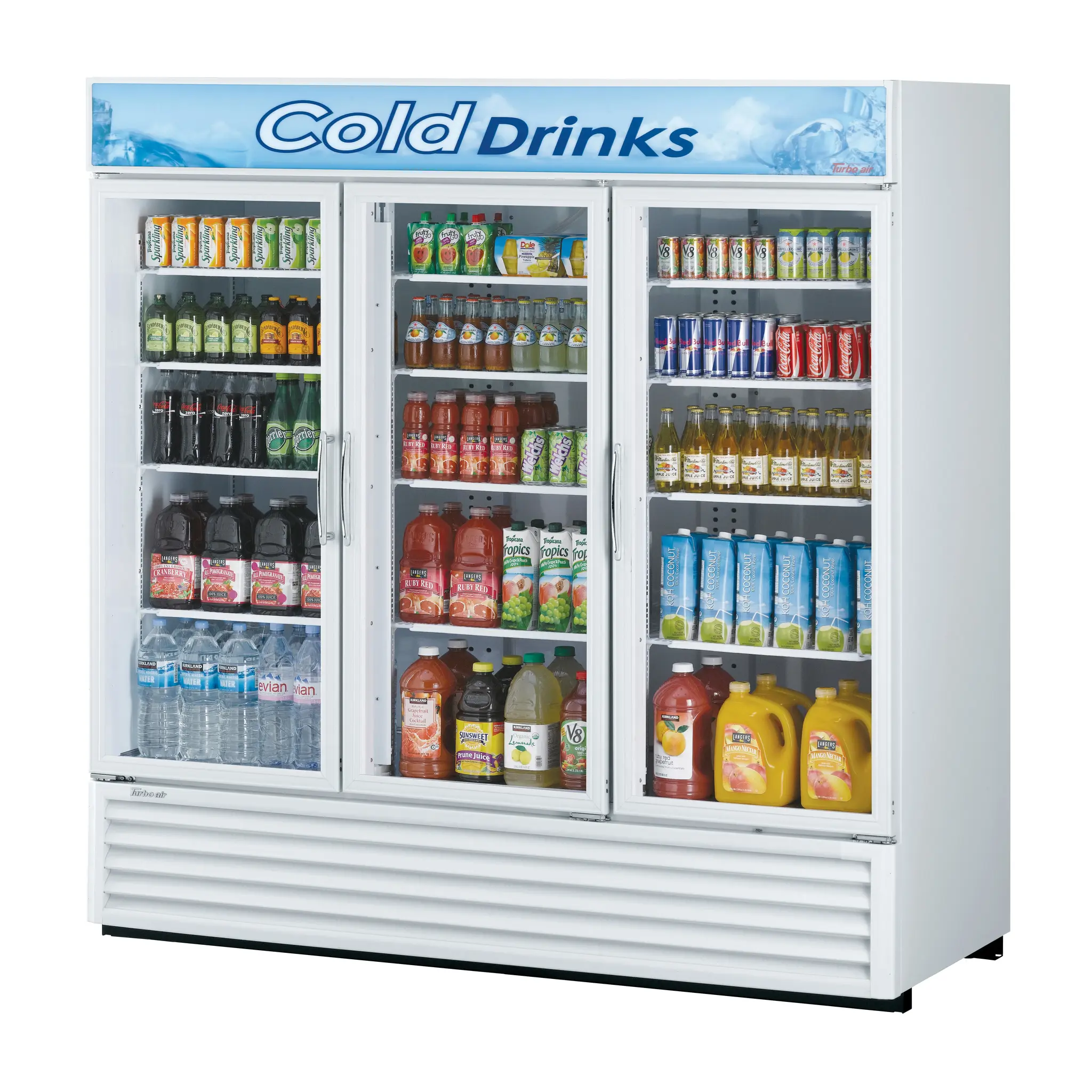 Unleash gastronomic brilliance with the Turbo Air TGM-72RS-N Refrigerator Merchandiser. This three-section refrigerated merchandiser is perfect for commercial restaurant use, offering a spacious 67.98 cu. ft. capacity to store and display a wide variety of food and beverages. The temperature range of 33F - 38F ensures optimal freshness and taste preservation. The three double pane Low-E self-closing swing glass doors not only provide easy access but also enhance energy efficiency. LED interior and canopy lighting beautifully showcase your products, while the energy conserving fan control and hot gas condensate system help reduce energy consumption and maintenance costs. With 12 adjustable PE coated wire shelves, you can customize the layout to suit your needs. The white cabinet and bottom mount compressor add a sleek and professional touch to any restaurant setting. This refrigerator merchandiser operates on R290 Hydrocarbon refrigerant, which is environmentally friendly. Trust Turbo Air, a reputable vendor in the industry, to deliver reliable and high-quality refrigeration solutions for your commercial restaurant needs.