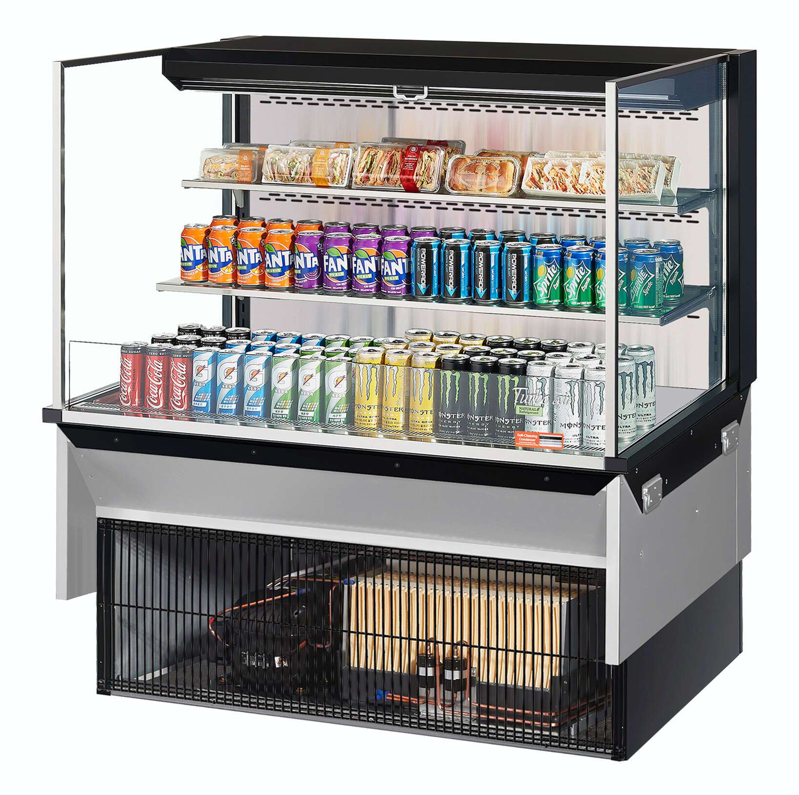 Empower your kitchen staff with the Turbo Air TOM-48L-UF-W(B)-3SI-N Open Display Case. This sleek and modern display case is designed to enhance impulsive sales in a commercial restaurant setting. With its low profile and glass side panels, customers can easily see and access the products on display. The self-cleaning condenser and hydrocarbon refrigerants ensure optimal performance and energy efficiency. The stainless steel interior, including the back wall and deck pans, is not only durable but also easy to clean. The bottom stainless steel solid shelf and glass shelves provide ample space for showcasing a variety of items. The perforated interior back wall and open top improve airflow, keeping products fresh for longer. Equipped with LED interior lighting and an energy-saving night curtain, this open display case is both visually appealing and cost-effective. Available in white and black color options, the Turbo Air TOM-48L-UF-W(B)-3SI-N is a must-have for any commercial restaurant looking to boost sales and create an inviting display for customers.