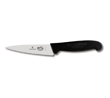 Enhance Your Restaurant's Culinary Efficiency with the Victorinox Swiss Army, 5.2033.12, Chef Knife. This high-quality knife is designed to meet the demands of a commercial restaurant kitchen. With its 5" blade and 1-1/4" width at the handle, it offers precision and control for slicing, dicing, and chopping ingredients. The wavy edge ensures effortless cutting through tough meats and crusty bread. The black Fibrox Pro handle provides a comfortable grip, reducing fatigue during long hours of use. Made from high carbon stainless steel, this knife is durable and resistant to corrosion, ensuring it will withstand the rigors of a busy kitchen. It is NSF certified, guaranteeing its safety and hygiene standards. Whether you're a professional chef or a culinary enthusiast, the Victorinox Swiss Army Chef Knife is a must-have tool for achieving culinary excellence in your restaurant.