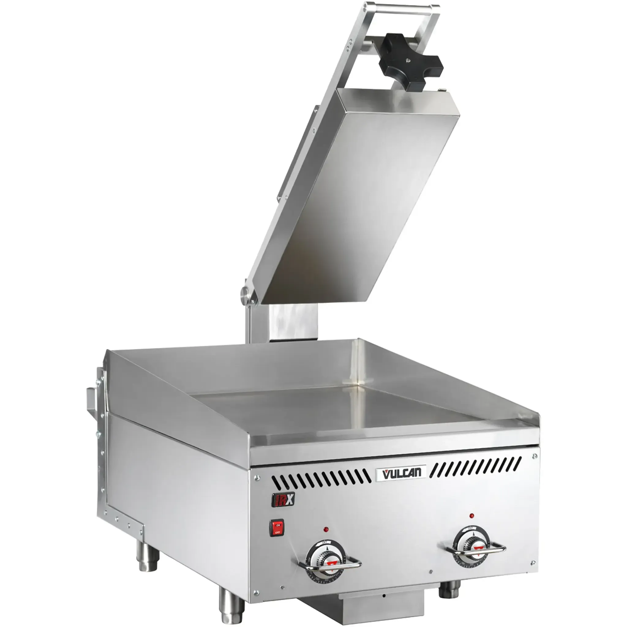 Create culinary magic with the Vulcan VMCS-201 Griddle With Platens. This electric griddle features a griddle clamshell hood and a grooved steel plate, allowing you to cook a variety of dishes with precision and efficiency. The thermostatic control allows you to adjust the temperature from 200 to 450 degrees Fahrenheit, ensuring perfect results every time. LED indicator lights provide clear visibility of the cooking process, while the anodized aluminum arm and stainless steel construction guarantee durability and easy cleaning. The VMCS-201 includes two Teflon sheets and a plate gap adjustment accessory, giving you even more versatility in your cooking. With a power output of 3.6 kW and NSF and cCSAus certifications, this griddle is perfect for any commercial restaurant. Elevate your culinary creations with the Vulcan VMCS-201 Griddle With Platens.