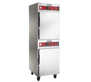 Introducing the Vulcan VRH88 Cook/Hold Cabinet, designed to simplify restaurant operations. This double-deck, mobile cabinet is a game-changer for commercial kitchens. With its mechanical temperature controls, you can easily roast your dishes at a consistent 250 F, ensuring perfect results every time. The cabinet has a generous capacity of 16 sheet pans or 32 hotel pans, allowing you to cook large quantities of food in one go. It comes with six wire shelves, providing ample space for your culinary creations. Made with stainless steel construction, this cabinet is built to withstand the demands of a busy restaurant kitchen. The Vulcan VRH88 also includes a stacking kit, allowing you to maximize your storage space. With its 5" casters, two of which are swivel with locks, this cabinet is easy to maneuver and secure in place. Upgrade your restaurant kitchen with the Vulcan VRH88 Cook/Hold Cabinet and experience the convenience and efficiency it brings.