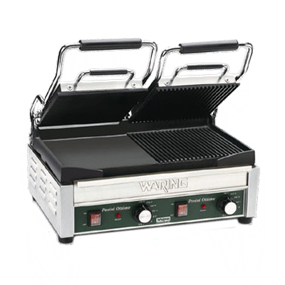 Unleash gastronomic brilliance with the Waring WDG300 Sandwich/Panini Grill. This dual surface grill is a must-have for any commercial restaurant. With a spacious 17" x 9-1/4" cooking surface, you can easily prepare multiple sandwiches or paninis at once, increasing efficiency and productivity in the kitchen. The hinged auto-balancing top plate with heat resistant handles ensures even cooking and allows for easy flipping of sandwiches. The half ribbed and half flat grill gives you the versatility to create a variety of delicious grilled creations. The adjustable thermostats, reaching up to 570F (300C), provide precise temperature control for perfect results every time. The indicator lights let you know when the grill is ready to use, and the brushed stainless steel body and removable drip tray make cleaning a breeze. Trust the Waring WDG300 to elevate your sandwich and panini game to new heights.