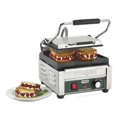 Serve with pride with the Waring WFG150T Sandwich/Panini Grill. This compact and flat toasting grill is a must-have for any commercial restaurant. With its timer and 120v/60/1-ph power supply, this grill is designed to deliver perfect toasts every time. The WFG150T is packed with features that make it ideal for busy restaurant kitchens. Its compact size allows for easy placement on countertops, saving valuable space. The timer ensures precise cooking, allowing chefs to multitask without worrying about overcooking. The grill's sturdy construction and high-quality materials guarantee durability and long-lasting performance. Whether you're making delicious paninis or toasting sandwiches, the Waring WFG150T is the perfect tool to elevate your restaurant's menu. Don't settle for anything less than the best. Choose the Waring WFG150T Sandwich/Panini Grill and serve your customers with pride.
